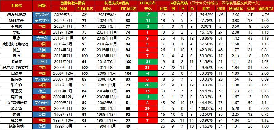 从2024年2月接手到2025年6月下课,他带队踢了14场正式比赛,仅取得4胜2平8负的成绩,胜率低至28.57%。这一数据不仅排在近30年国足主帅倒数第三位(仅高于扬科维奇的27.78%和李霄鹏的25%)。